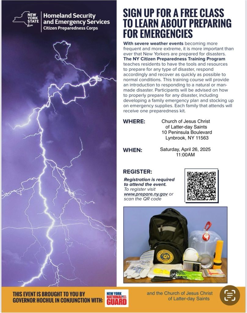 With severe weather events becoming more frequent and more extreme, it is more important than ever that New Yorkers be prepared for disasters. The New York Citizen Preparedness Training Program teaches residents to have the tools and resources to prepare for any type of disaster, respond accordingly, and recover as quickly as possible to normal conditions. This training course will provide an introduction to responding to a natural or man-made disaster. Participants will be advised on how to properly prepare for any disaster, including developing a family emergency plan and stocking up on emergency supplies. Each family that attends will receive one preparedness kit.