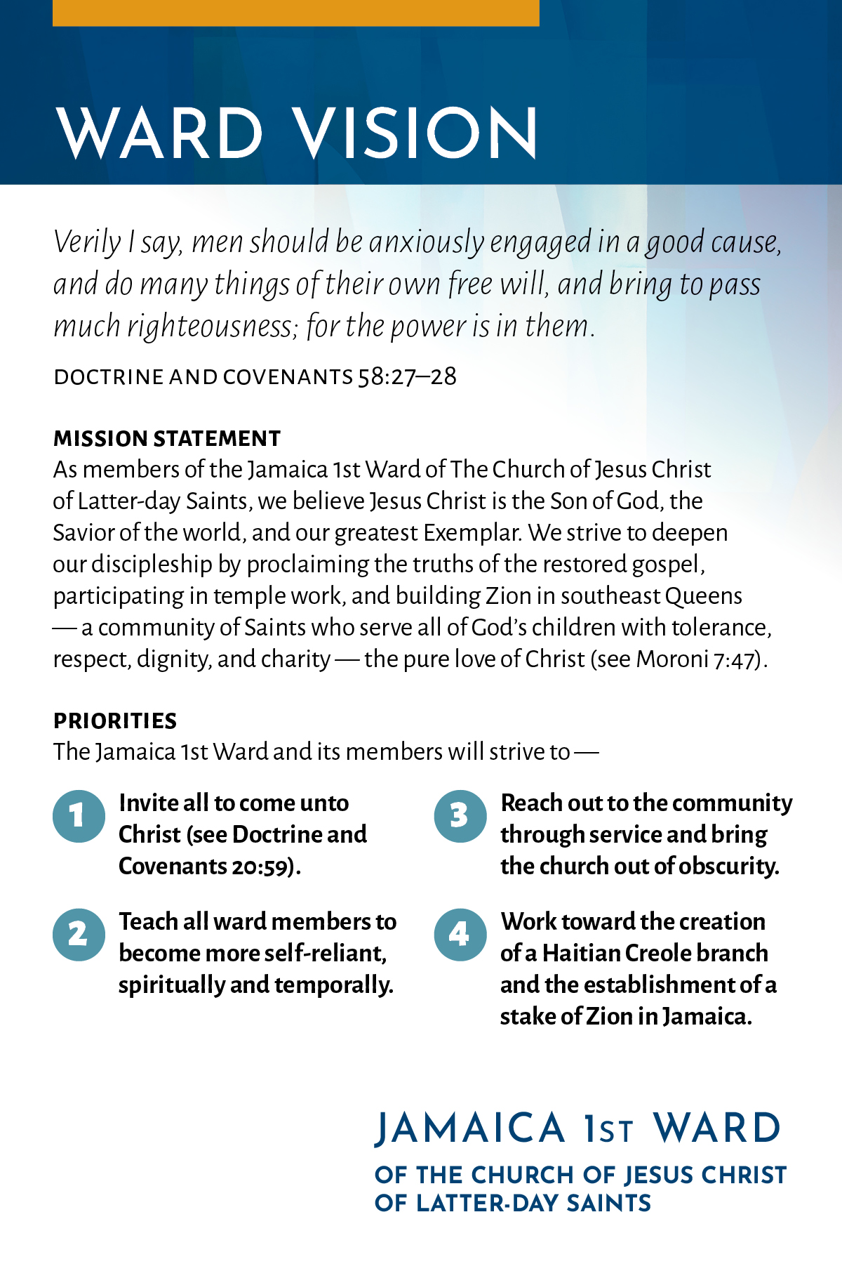 We will work toward these priorities collectively and individually (see Doctrine and Covenants 1:30) by making the Jamaica 1st Ward a place where: